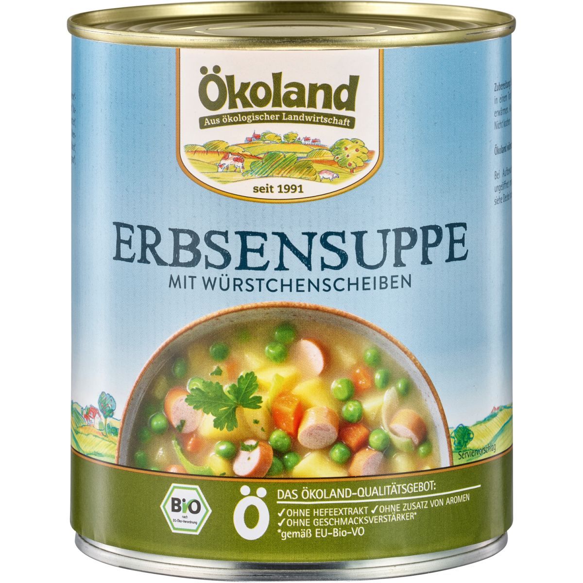 Erbsen gehören zu den ältesten Kulturpflanzen der Menschheit, sie haben ihren Ursprung im Orient. Erbsen sind ein ganz besonderes Gemüse – mit ihnen liefert unsere Ökoland Erbsensuppe wertvolles Eiweiß! Unsere Erbsen werden schonend zubereitet, gemeinsam mit typischem Suppengemüse und traditionellen Gewürzen perfekt abgeschmeckt. Und dann geben wir – für herrlich herzhaften Geschmack – unsere original Ökoland Würstchenscheiben dazu!