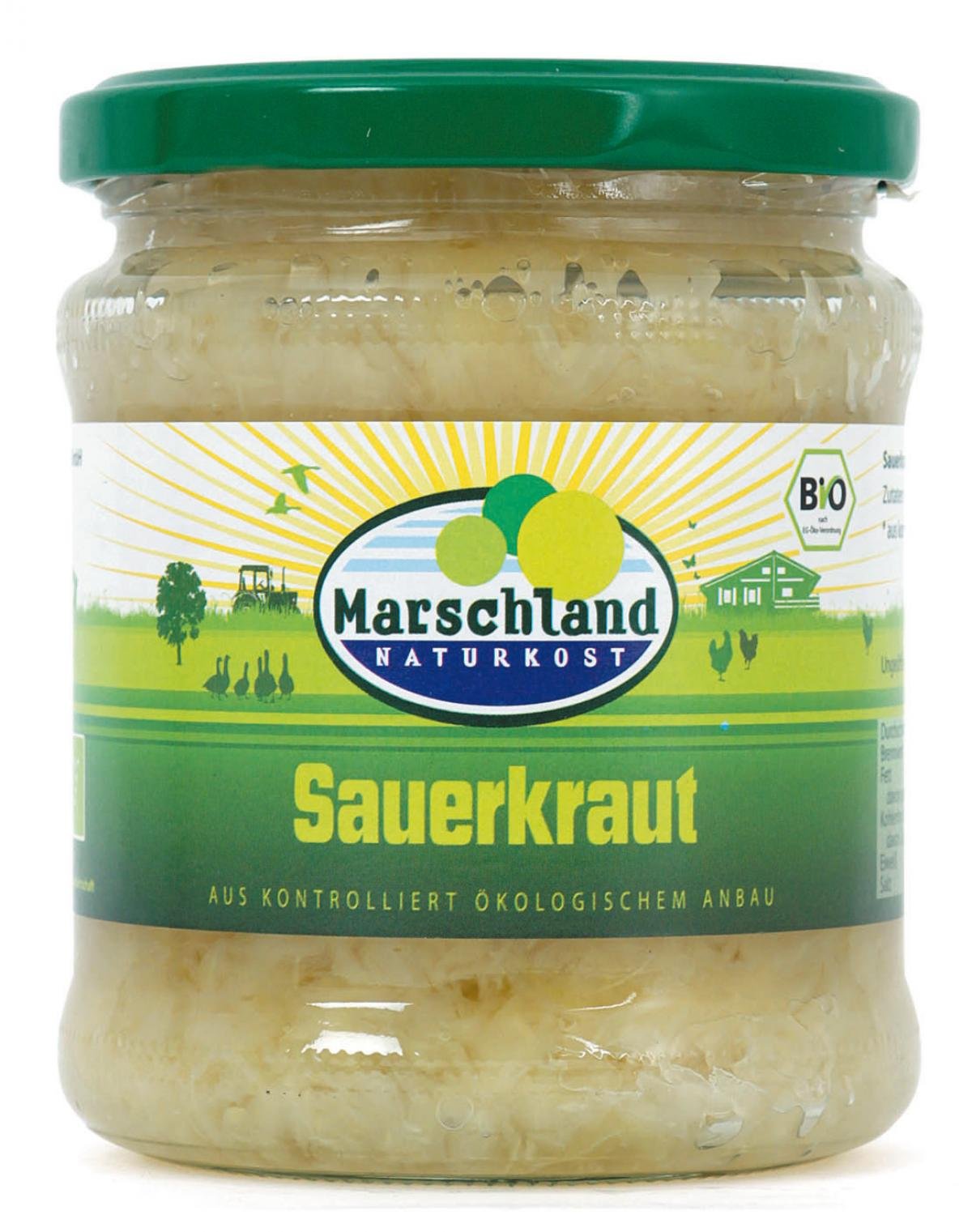 In annähernd gleichmäßige Streifen geschnittener biologischer Weißkohl, aus dem Sauerkraut durch natürliche Milchsäuregärung nach Zusatz von Meersalz entstanden ist, welches durch Pasteurisation im luftdicht verschlossenen Behältnis dauerhaft haltbar gemacht worden ist.