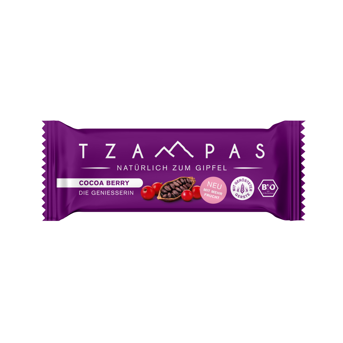 TZAMPAS Cocoa Berry – Die Genießerin ist eine harmonisch abgestimmte Mischung aus gerösteter Gerste, Haselnuss, Kakao und Schokoladenstückchen sowie einem Hauch von Zimt. Die feine Fruchtsäure der Johannisbeere ist der Ideale Gegenspieler der schokoladigen Grundmasse. Genau der richtige Clean Eating Energieriegel für (aktive) Genießer:innen, die es nicht zu süß mögen.